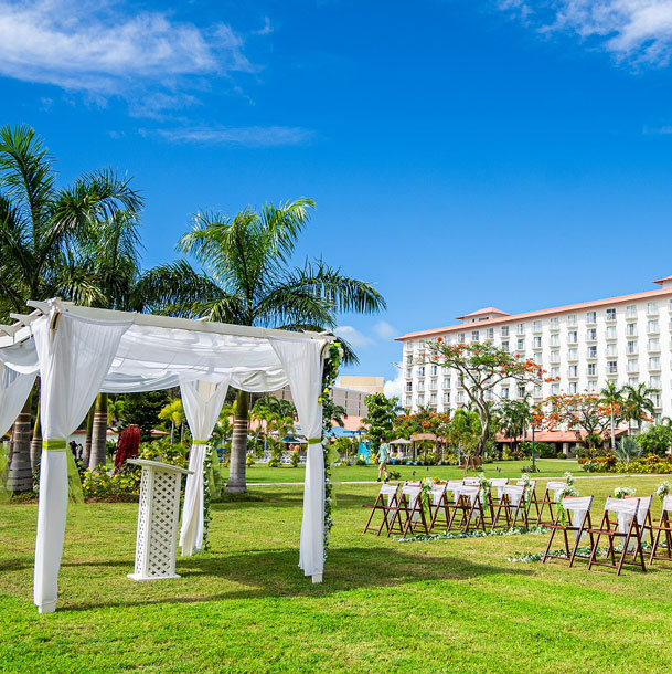 ケンジントンホテル敷地内にある独立したチャペル。高い天井、前面ガラスから臨むマリアナブルーの海。リゾートならではのゆったりとした挙式が行えます。ビーチでの撮影もおすすめです。