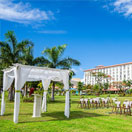 眼下にマリアナブルーの海が広がる絶好のロケーションの中での挙式。